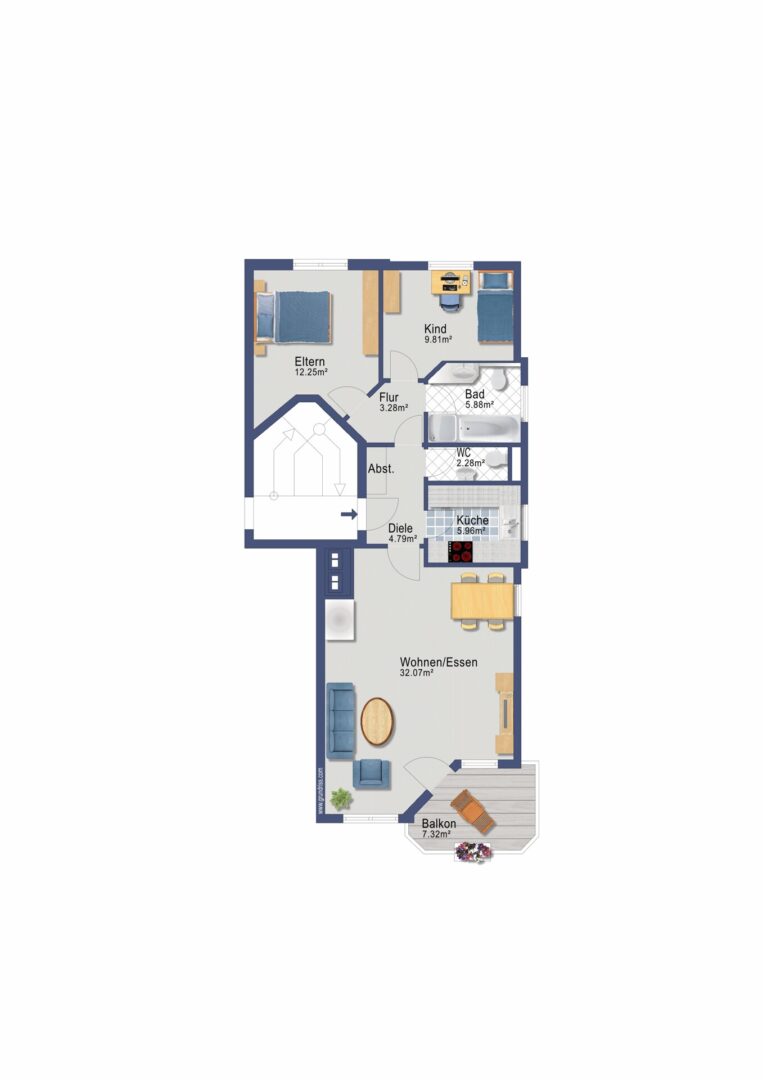 Sie betreten die Wohnung und gelangen in den Wohnzimmerbereich mit einem Kamin. Vom Wohnzimmer aus erreichen Sie den nach Südwesten ausgerichteten Balkon.